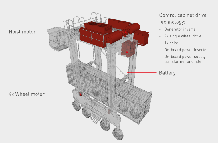 For the transport of containers in ports or other transhipment centres, suitable vehicles are needed that can stack containers as well as transport them. The straddle carrier is ideally suited for such cases. In the past, such systems were equipped with diesel drives and hydraulic power units, but today diesel-electric systems are the best available technology.